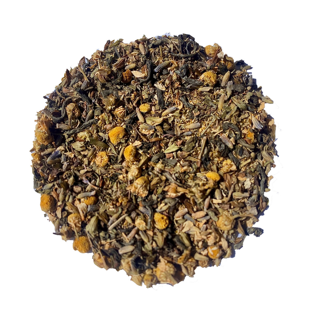 Proprietary herbal blend: organic gunpowder green tea (camellia sinensis), organic chamomile flower (matricaria chamomilla), organic lavender flower (lavandula stoechas ), organic lemon balm leaf (melissa officinalis).
